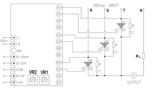 9、触发器内置220V工作电源,与R、S、T主电路没有相位关系。其中“L”接R、S、T主电路的任一路,“N”必须接零线。触发器无须外接同步变压器,也无须外接直流电源。