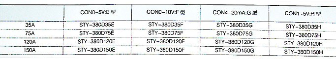 三相交流调压模块STY原则上应用于380VA、50HZ的三相电网上,根据控制信号的不同分E、F、G、H型等四类,以下为型号表。
