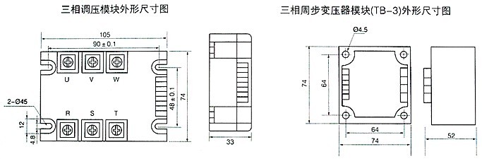 三相交流调压模块(以下简称三相调压模块STY)内部集三相电相位检测,移相电路、触发电路和三组反并联单向可控硅于一体,在我公司提供的三相同步变压器模块(型号为TB-3)的支持下(同步变压器还兼作提供三相调压模块内部工作电源用),不需外部任何电路和工作电源,便可以自动控制或外接电位器手动控制,达到改变可控硅导通角即可实现三相负载电压从0V到电网全电压的无级可调。