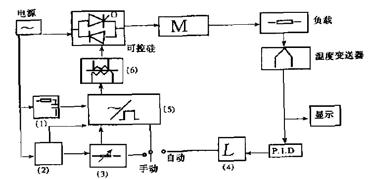(1)同步RC滤波器 (2)集成直流稳压电源 (3)手动控制调节 (4)输入信号限幅衰减电路 (5)集成可控硅移相触发器 (6)脉冲放大与隔离压器等环节